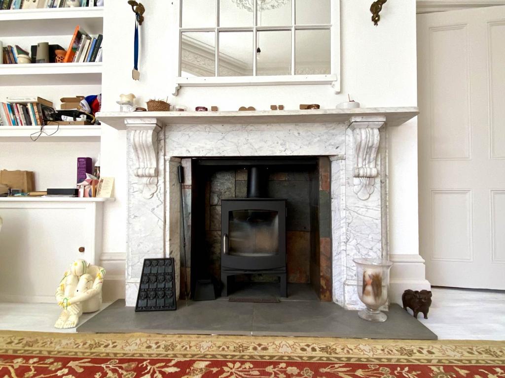 Walk - in uPVC double glazed bay window to side. Focal point of log burner within a fireplace surround having an exposed brick back, mosaic tiled hearth and a marble mantle with surround. TV point. 2 Radiators. High skirting boards. 2 Ceiling Roses. Ornate ceiling coving and cornice. Exposed floorboards.