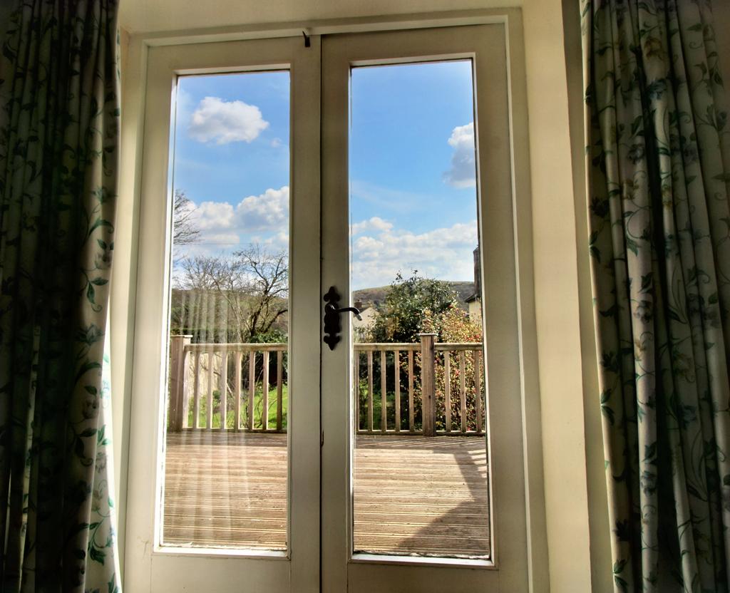 BEDROOM 1 (5.00m x 3.60m approx)(16'4" x 11'8" approx) with carpet, radiator, window with secondary glazing, original open fireplace, built in wardrobes and patio doors opening onto a balcony offering views of the surrounding hills and garden.