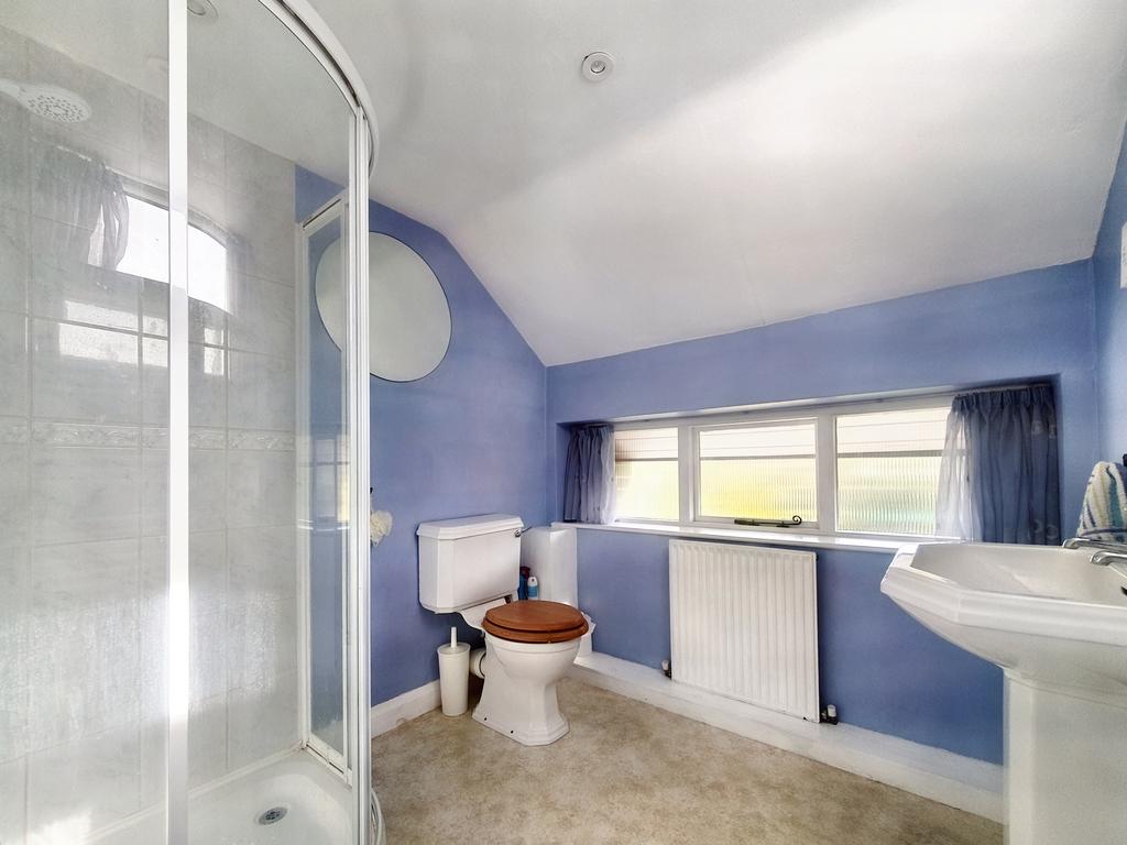 SHOWER ROOM with vinyl floor, radiator, two windows, large corner shower fully tiled with Triton electric shower, heated towel rail, handbasin, low level W/C and electric shaver point.