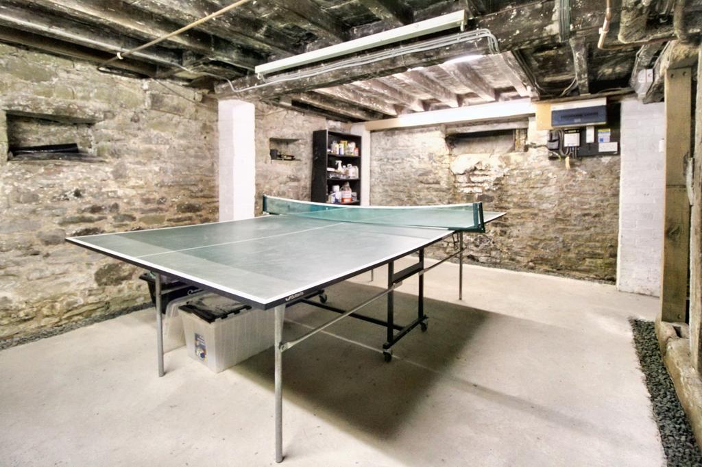 CELLAR (9.80m x 5.00m approx)(32'1" x 16'4" approx) with wooden stairs, exposed beams, stone walls, lighting and power points and is currently used as games room.