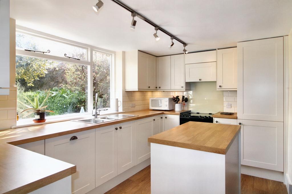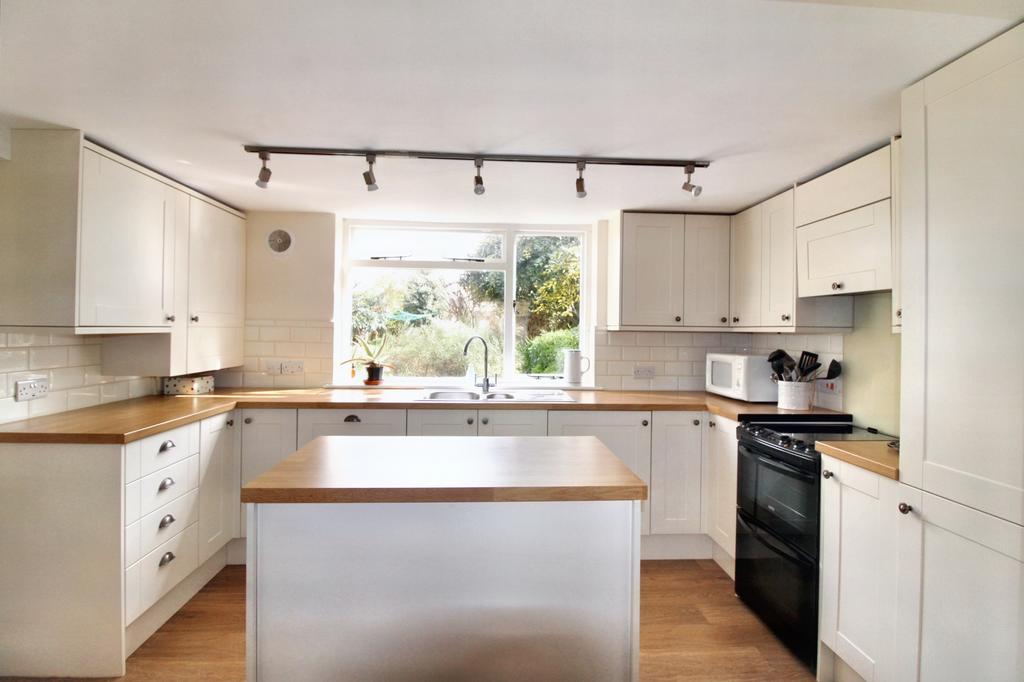 KITCHEN (3.90m x 2.60m approx)(12'7" x 8'5" approx) with laminate floor, island, numerous modern kitchen units and drawers, window overlooking the beautiful country style cottage garden, tiled splash backs, double sink. Integrated fridge, washing machine and dishwasher, oven with hood over.