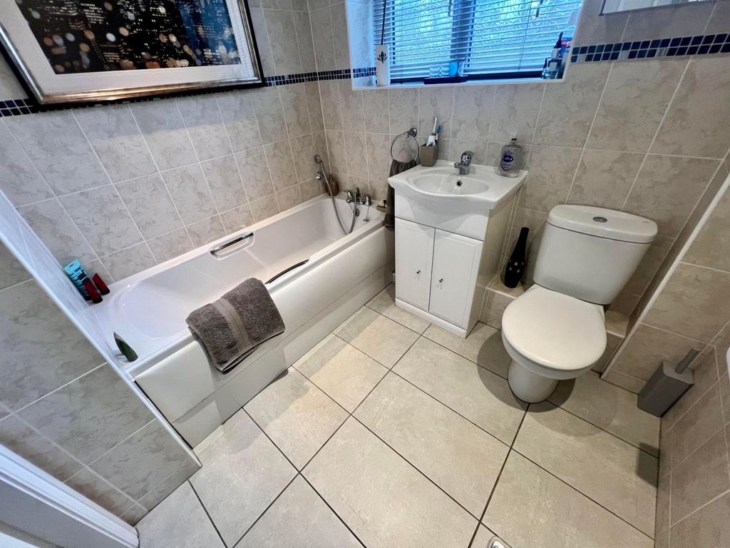 UPVC double glazed opaque window to the side aspect, panelled bath, vanity wash hand basin, low flush w.c
