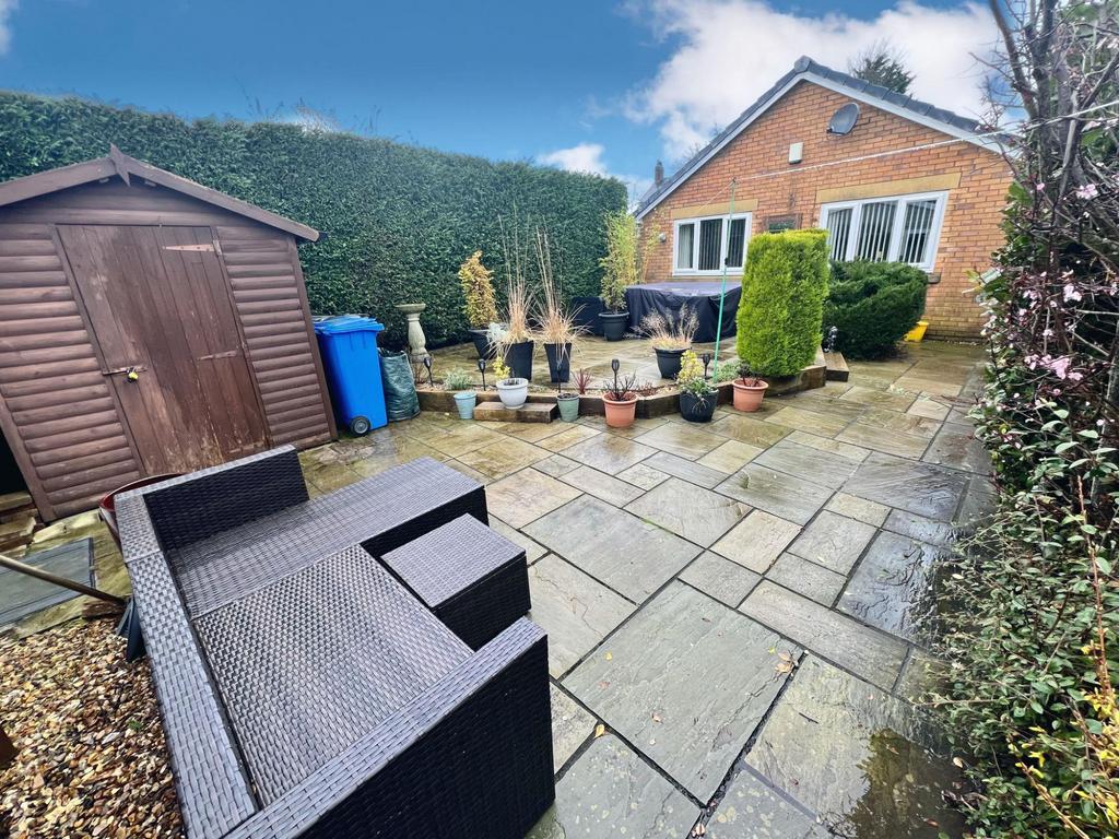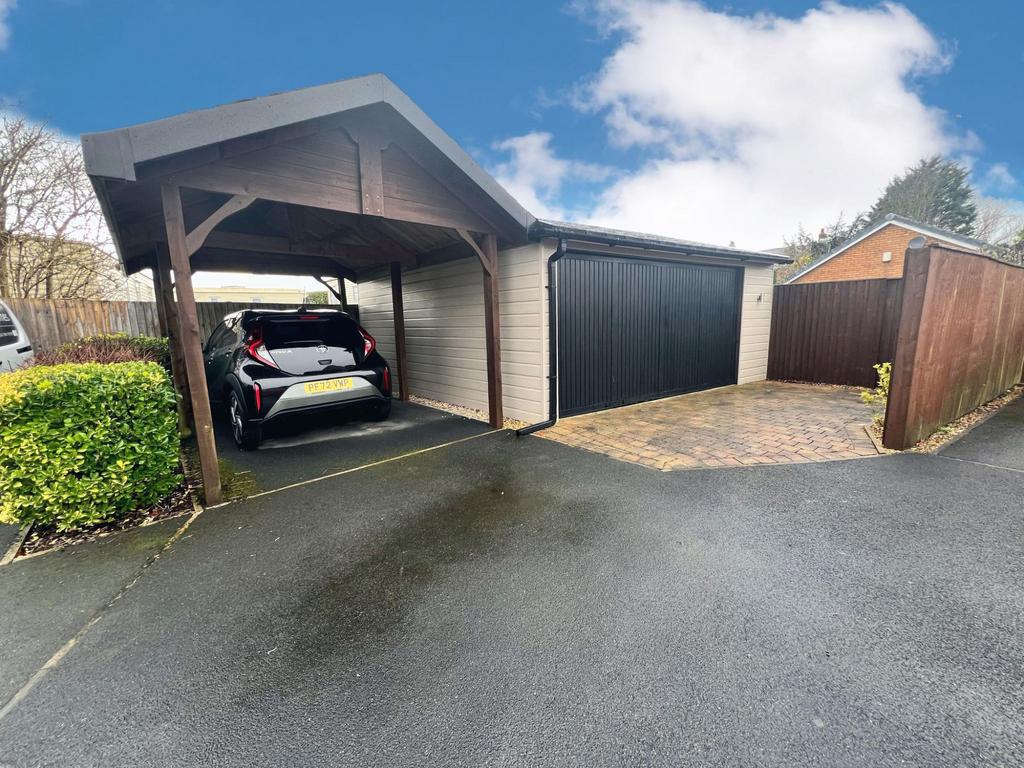 Private enclosed rear garden, Indian paved with hedges and shrubs to borders, car port and driveway.