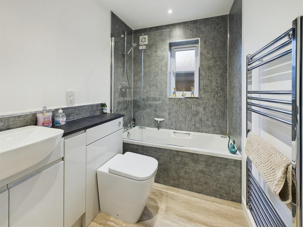 7' 4" x 5' 5" (2.24m x 1.65m) Double glazed window to side. Fitted with a panelled bath with shower over and screen. Wash hand basin and WC within vanity unit. Extractor fan. Luxury Vinyl Tiled Flooring.
