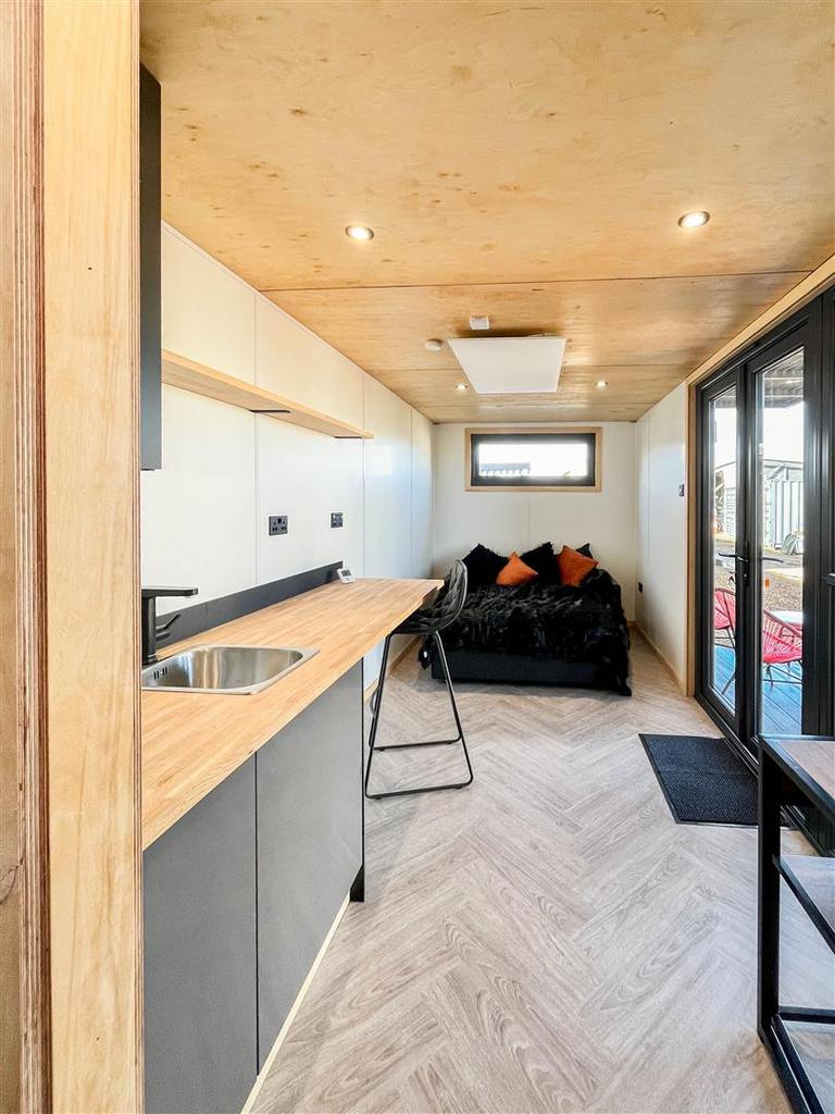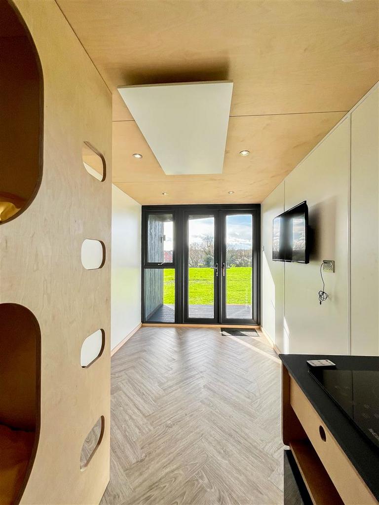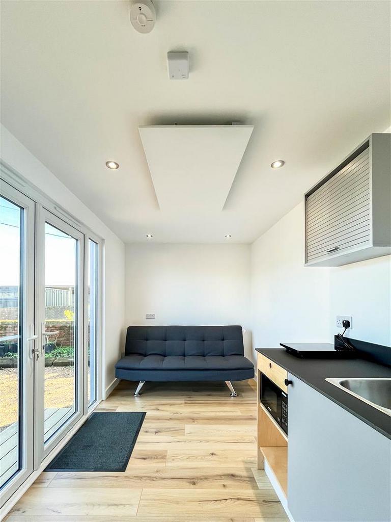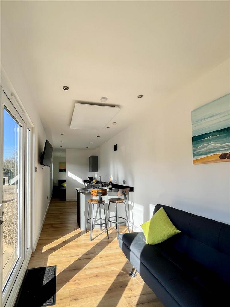 Lounge - PLEASE bear in mind the layout is purely an example you can bespoke to your requirements. The lounge has laminate wood effect flooring which runs throughout the unit. Television point and an above head panel heater, door to the bathroom and open plan to the kitchen, plenty of space for a double sofa bed for guests.