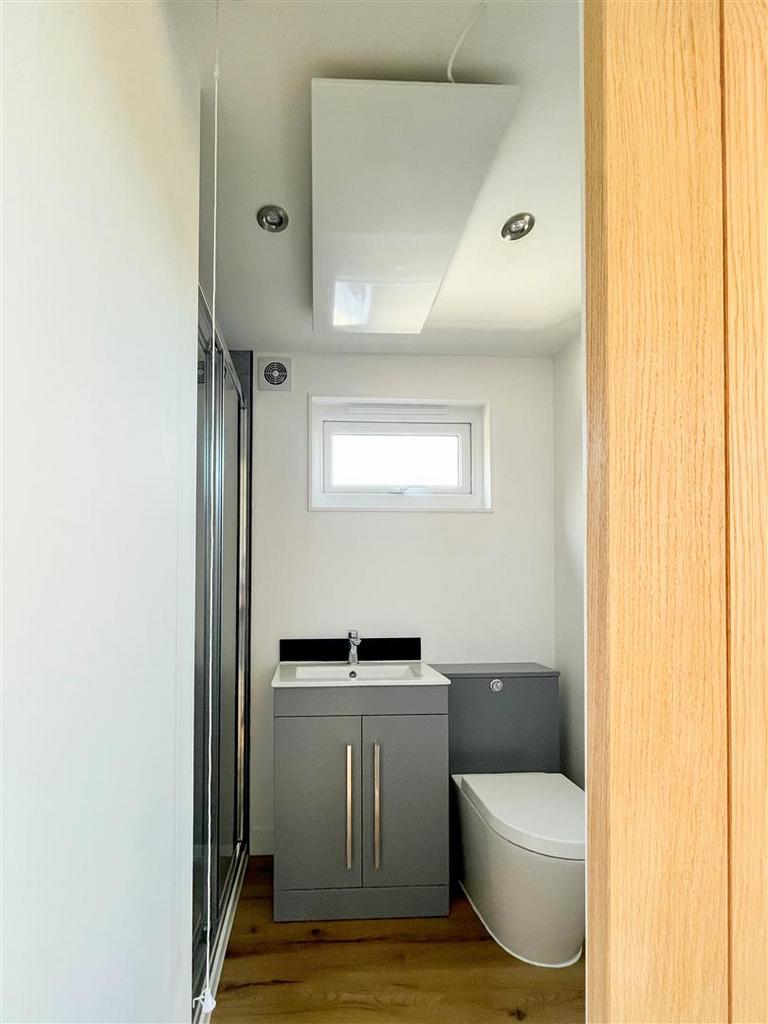 Bathroom - Sliding door, walk in shower cubicle, close coupled w/c, hand wash basin with double vanity cupboards below, expel air, down lighting and a double glazed window to the side.