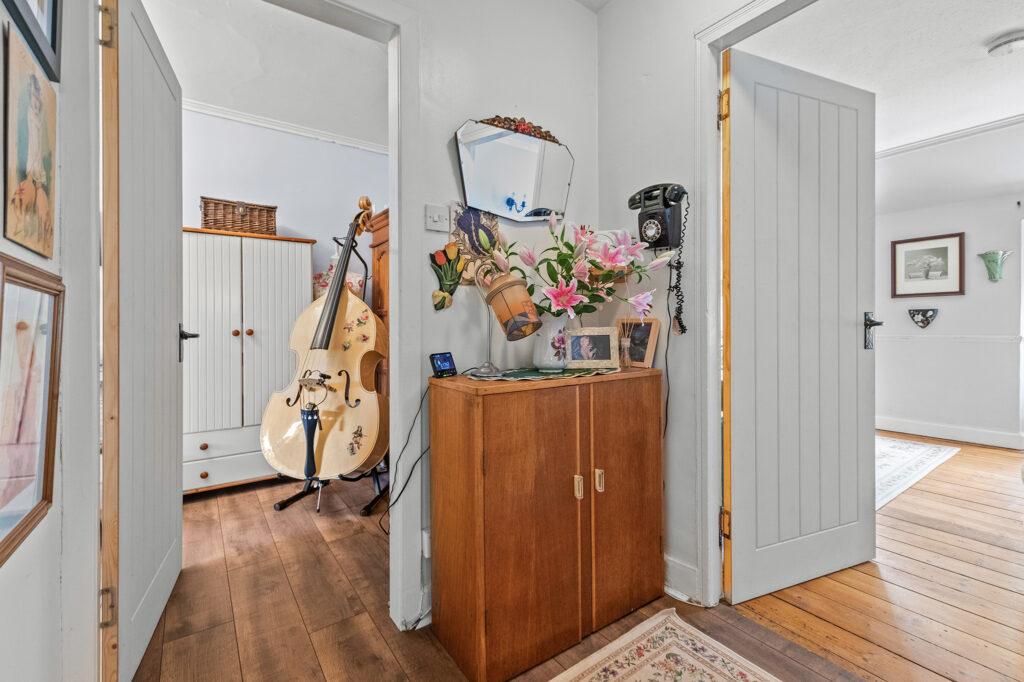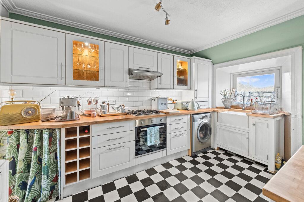 The kitchen provides an excellent selection of wall and base units together with a gas hob, oven, and cooker hood, with space for additional appliances. In addition, there is a rear facing window, butler sink, vinyl flooring, subway tile splash back and room for a dining suite.