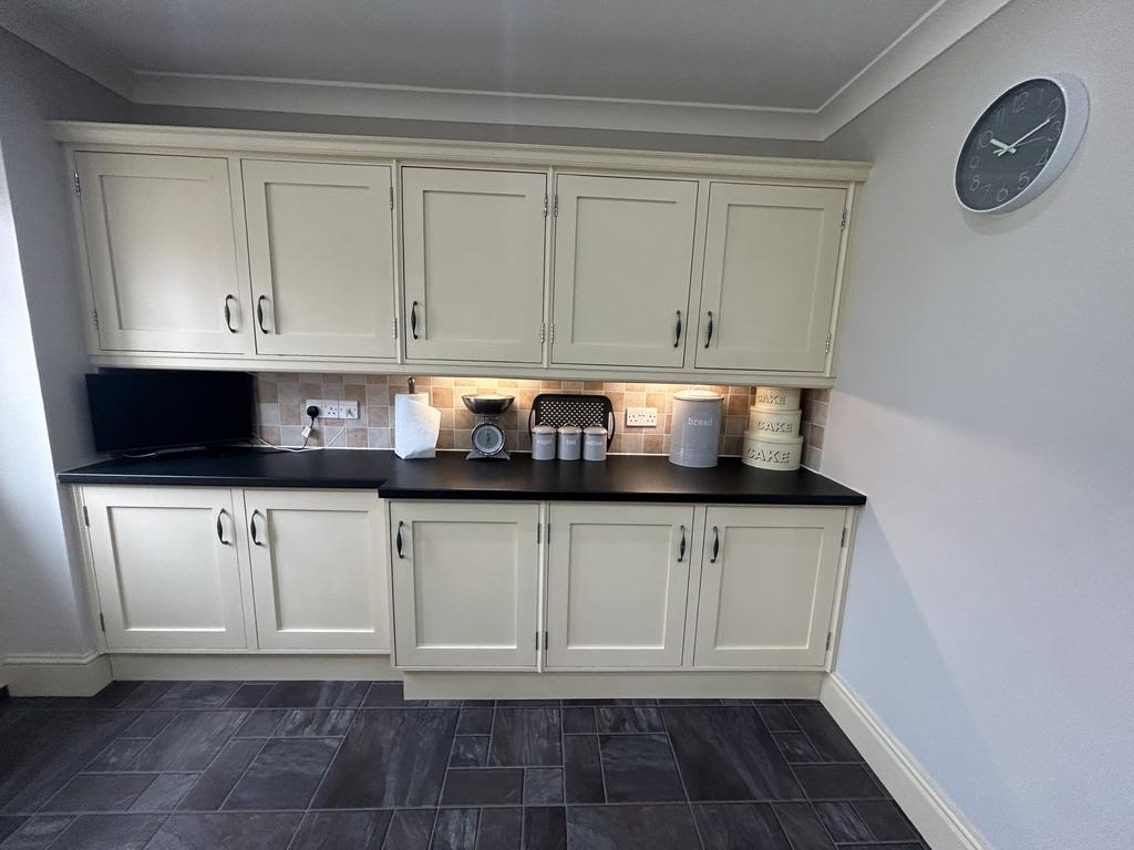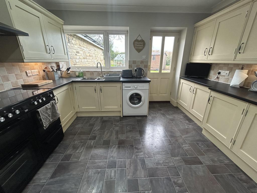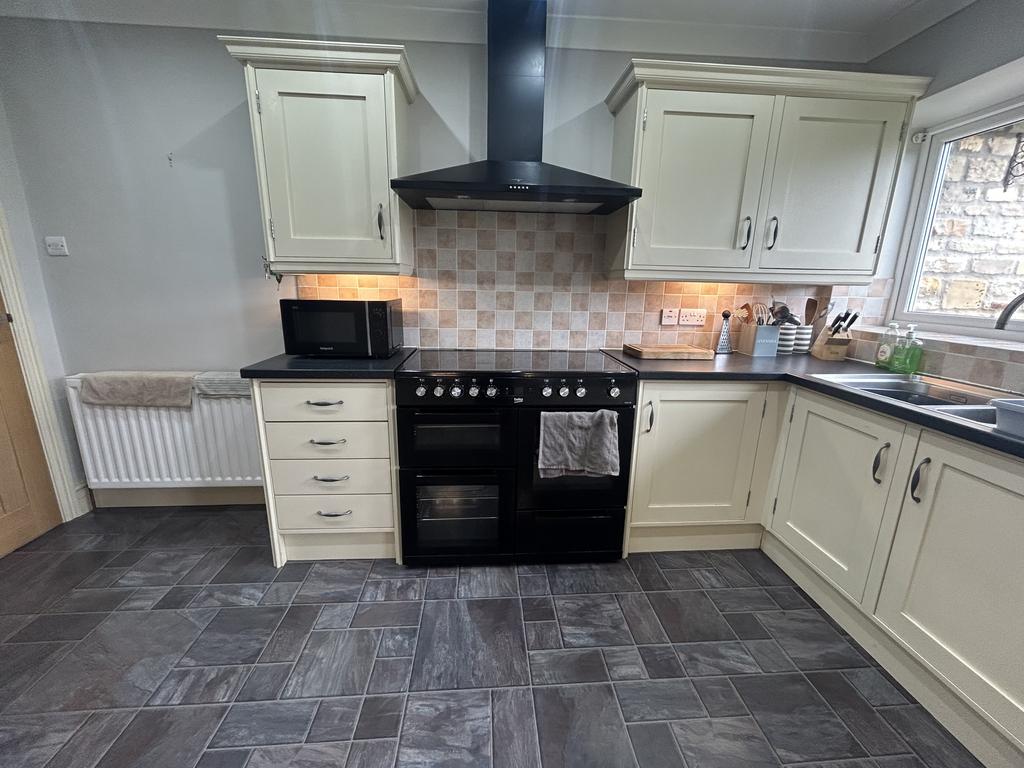 Kitchen (4.07 m x 3.72 m) with range of fitted wall and floor units in cream, dark laminate worktops, tiled splashbacks, Beko Range cooker in black with Belling chimney extractor above to match. 1½ bowl stainless steel sink with drainer, downlights in ceiling, plumbing for washing machine, radiator, tile effect vinyl flooring, large upvc picture window and double glazed timber door to rear garden.