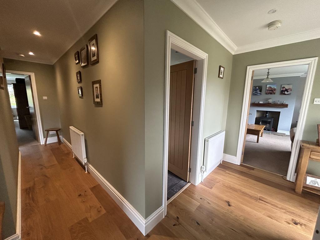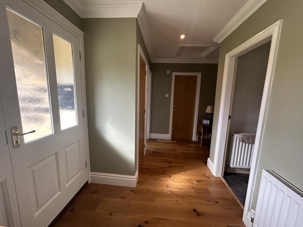 Passage with loft hatch, oak laminate flooring, radiator, downlights and smoke alarm.