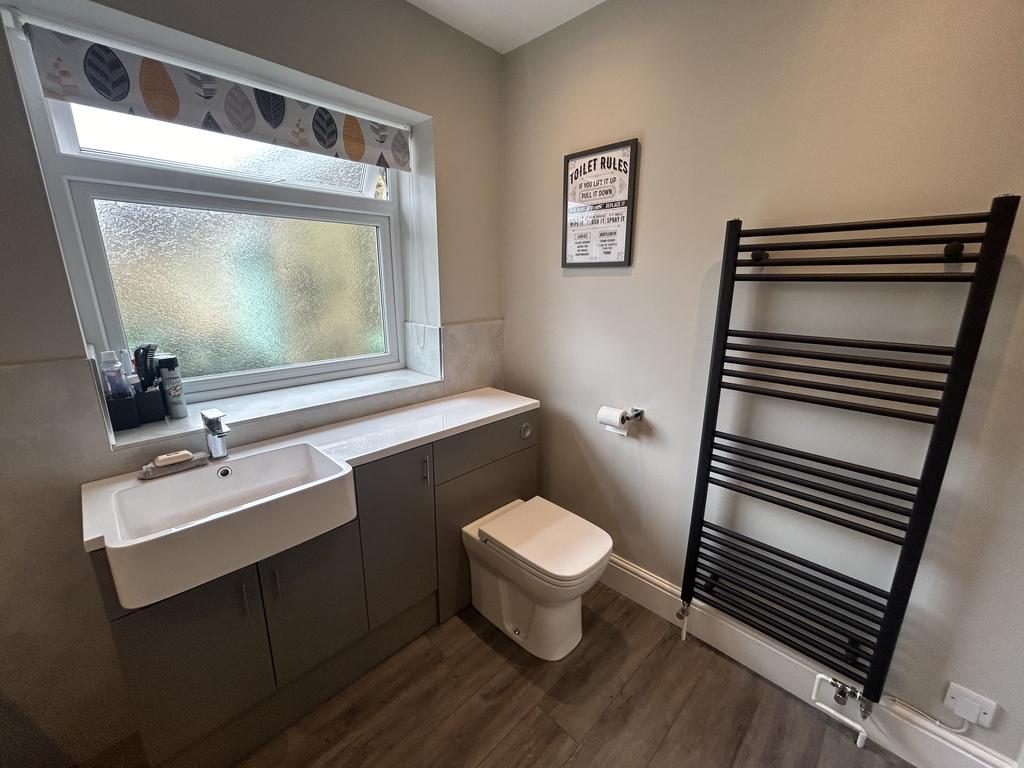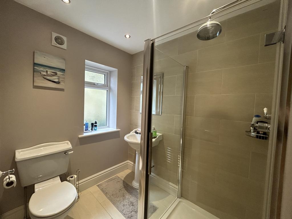 Ensuite Shower Room (2.09 m x 2.04 m) Fully tiled shower cubicle, W.C., pedestal basin, heated towel rail, extractor fan, downlights, upvc window, tiled flooring and underfloor heating.