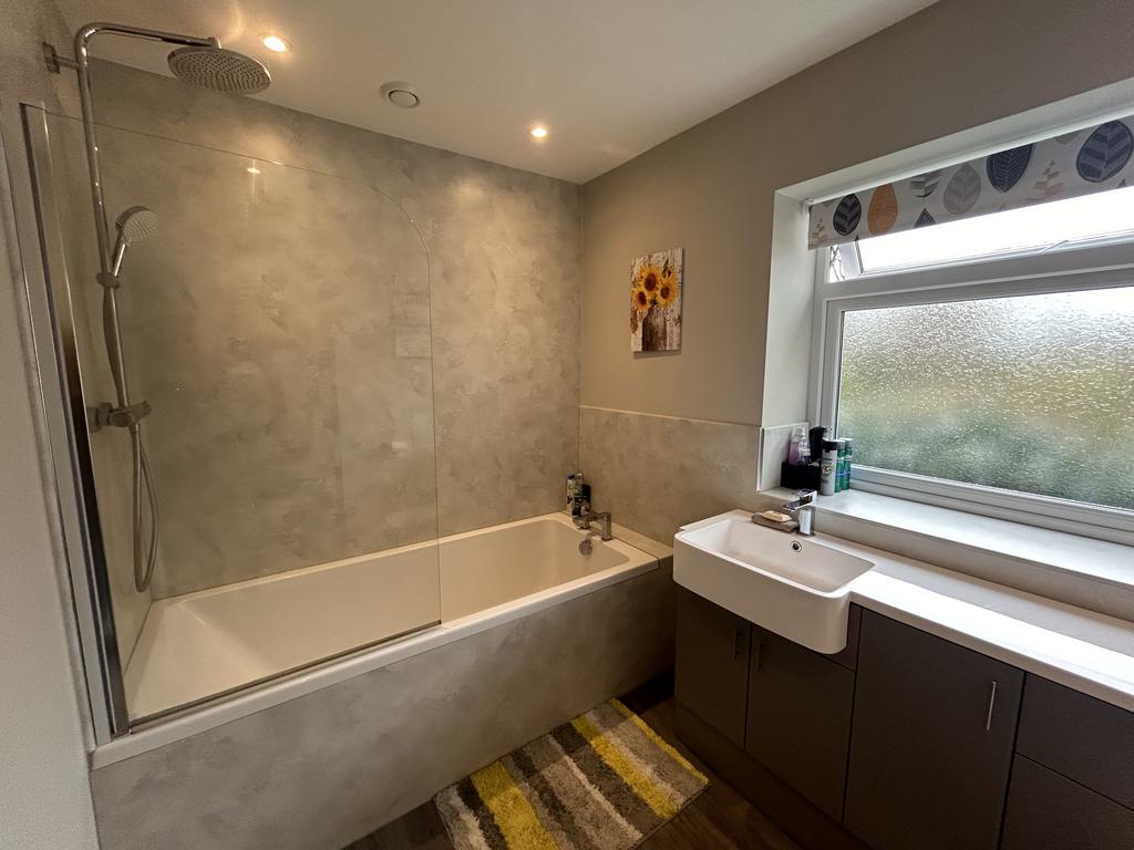 Main Bathroom (2.06 m x 1.70 m) Bath with dual headed shower over and multi-panel wall finish. Combined W.C. and wash basin in vanity unit with cupboards, upvc window, heated towel rail, extractor fan, downlights and laminate effect flooring.