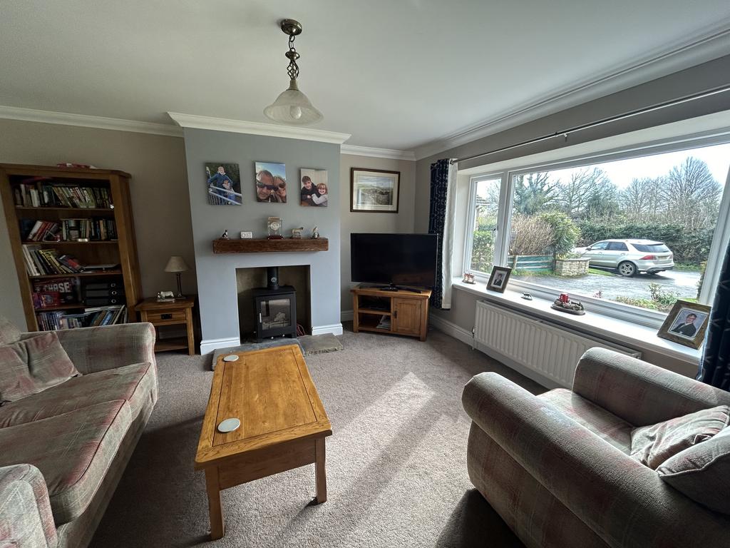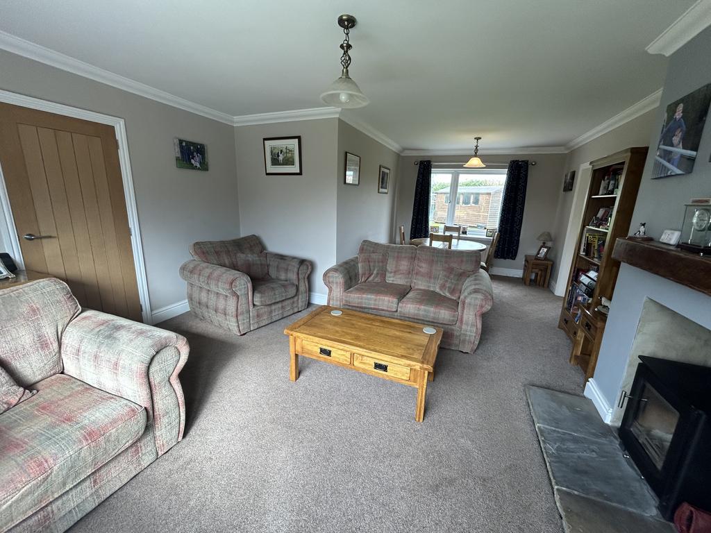 Open Plan Living Room with Dining Area (6.76 m x 4.55 m) with large upvc picture windows front and rear, multi-fuel stove set in recess on a flagstone hearth with timber