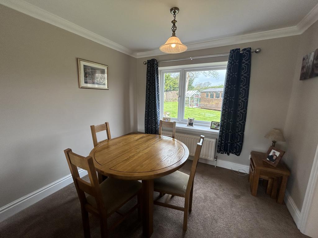 mantel above, radiator, pendant light, TV point and fitted carpet. The dining area to the rear has a radiator, pendant light and fitted carpet. Door into:-