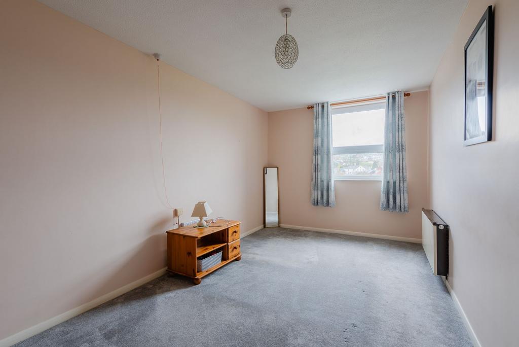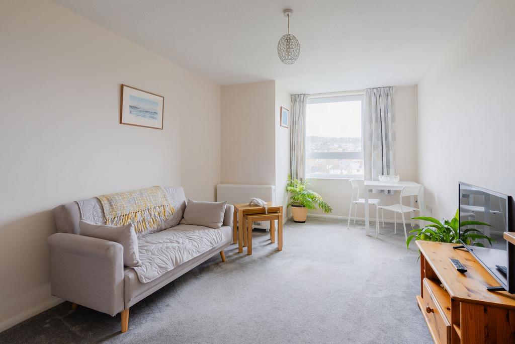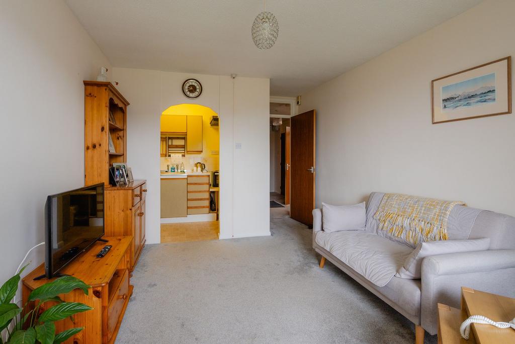 The flat itself has a hallway with a large walk-in store and the bathroom. There’s a large living room with an opening through to the kitchen, and the double bedroom (which has built in wardrobes) also enjoys the views. The property has uPVC windows to the front and programmable electric radiators.