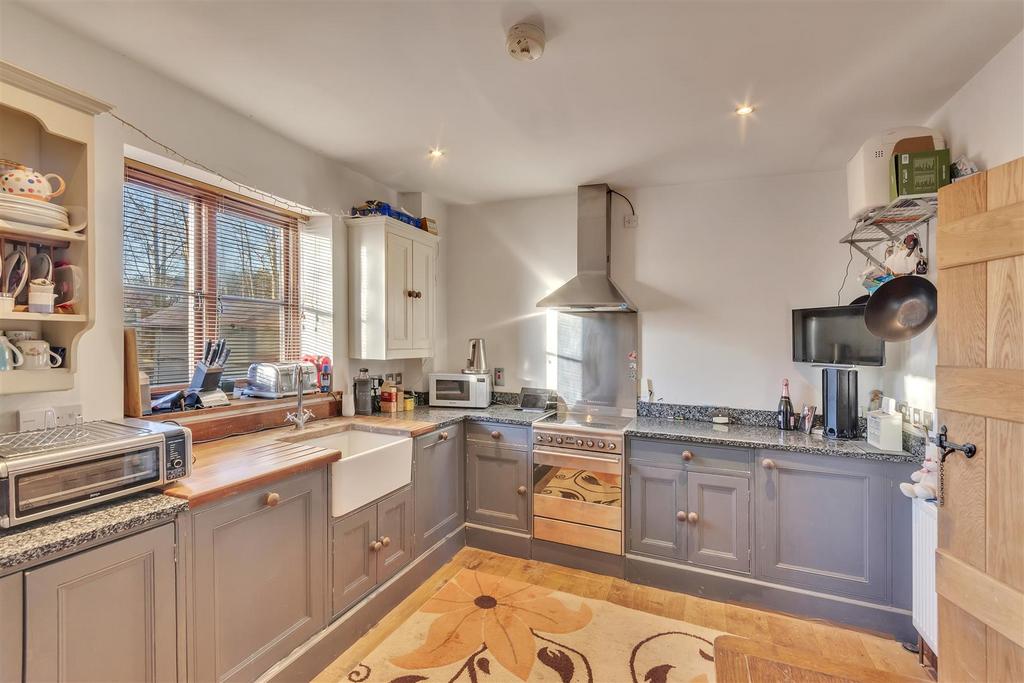 Kitchen Breakfast Room - 3.94m x 3.18m - Fitted with a range of wooden base units with granite worksurfaces over and Belfast sink with taps. Matching range of eye level units and open display cabinet. Space for cooker, housing Oil central heating boiler (replaced during December 2023), radiator, inset ceiling lights and window to rear.