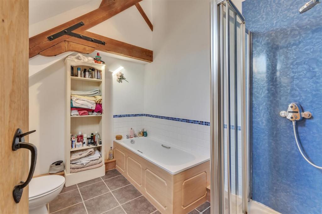 Bathroom - 2.28m x 2.90m - Fitted with a four piece suite comprising of low flush wc, wash hand basin, panelled bath and separate shower unit with glass door. Part tiled walls and tiled flooring, heated towel rail, Velux window and exposed ceiling beam with vaulted ceiling.