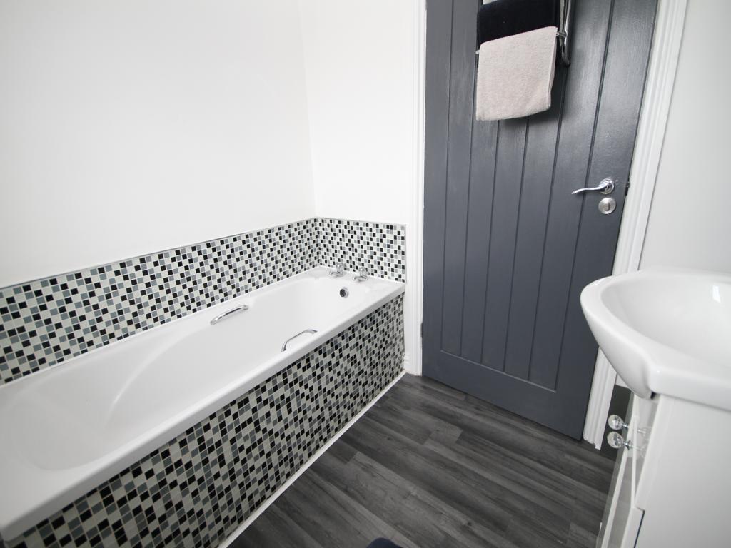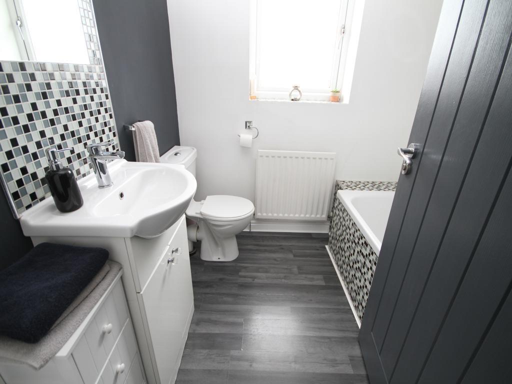 Bathroom - Modern three piece suite comprising bath, low suite wc, vanity sink unit, radiator and double glazed window.