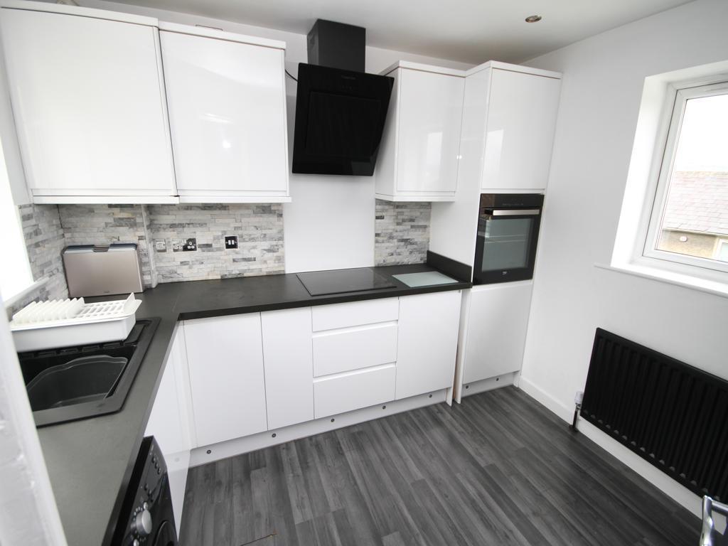 Kitchen - 3.12m x 3.12m (10'3" x 10'3") - White fitted wall and base units incorporating sink unit, oven, hob and extractor hood, tiled splashback, plumbing for auto washer, two double glazed windows.