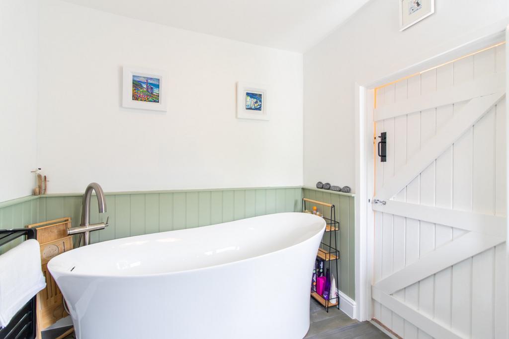 There are two further good-sized double bedrooms, one to the front aspect and one to the rear. Both also benefit from high ceilings and are equally well presented with flawless décor. The fourth bedroom overlooks the front of the property enjoying the open fields beyond and has superb storage right across one side. Previously used as a bedroom, it is currently the family office, and with ample space and dual aspect windows it offers plenty of natural light. The family bathroom is delightful, decorated in pale sage greens to the panelled walls contrasting with white to the walls and beautiful handmade tiles to the splash back. The luxury suite consists of a freestanding oval-shaped bathtub, freestanding Grohe tap and WC, together with a modern heated towel rail, smart LED fitted mirror and stripped wooden flooring. The bathroom enjoys rear view garden and paddock views.