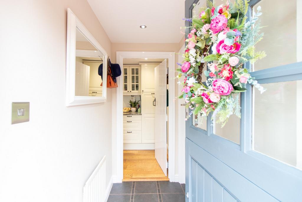 The delightful breakfast kitchen has an excellent range of contemporary units sitting beneath smart granite countertops. There is a top of the range Falcon electric range cooker with induction hob (available by separate negotiation), an inset 1.5 Franke sink and mixer tap with waste disposal, and an under counter integrated dishwasher and fridge. The breakfast bar offers further space for food preparation and casual family dining and creates a natural divide with a step leading up to the dining/family area of the kitchen. With a south facing aspect and views across the pretty courtyard, gardens and your own stables and land, the bi-folding doors really make the most of this idyllic spot, blurring the divide between inside and out during the long hot summer months. This lovely dining area has ample space for a family dining table and chairs but could equally be used as a further sitting room. It also still has the original open fireplace, although currently not used, and useful understairs storage. The smart engineered oak flooring is laid to the dining space and throughout the kitchen where steps down lead to the lower kitchen area with a laundry and boot room to one side and the conveniently situated ground floor a shower room to the other. The superbly created laundry and utility room offers ample further storage with some wonderful antique stripped pine cabinets, including the housing for a further tall fridge and freezer. It also features stripped pine countertops with an inset Belfast laundry sink and mixer tap and has a window overlooking the unspoilt open field views to the front of the property. Leading from this, and an absolute must for both dog lovers and those with equestrian pursuits, is an excellent boot room, again overlooking the unspoilt front aspect is offers ample storage and tiled flooring. Across from the lower kitchen area is a well-placed and very convenient ground floor shower room with dual aspect obscured glass windows to the front and beautifully fitted with a large walk-in double shower and a modern “midnight blue” vanity unit housing a white inset hand basin, low level WC, contemporary heated towel rail and smart LED fitted mirror.