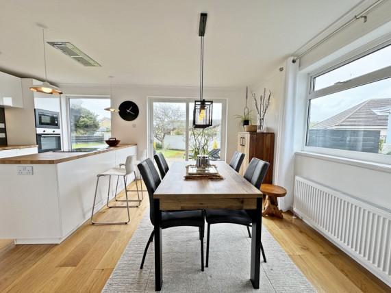 Step into the dining area, where new uPVC double glazed sliding doors seamlessly connect indoor and outdoor living spaces, flooding the interior with natural light and offering easy access to the beautifully landscaped garden beyond.