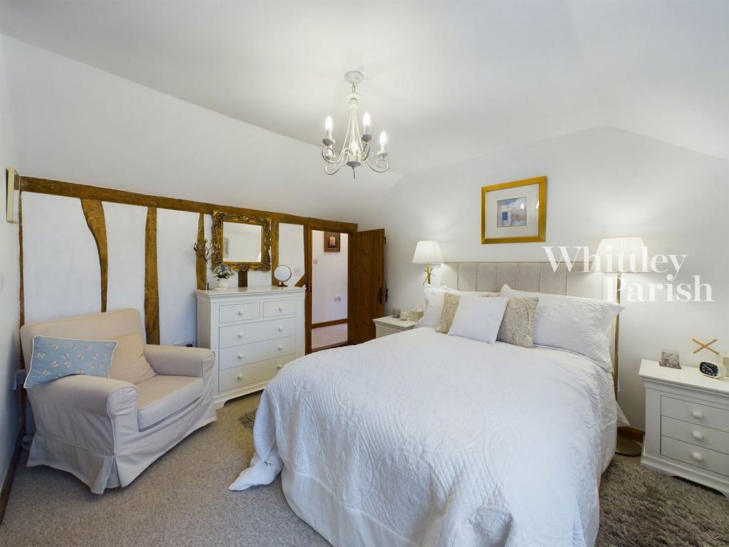 A generous principal bedroom with the luxury of en-suite facilities. Exposed timbers and beams.