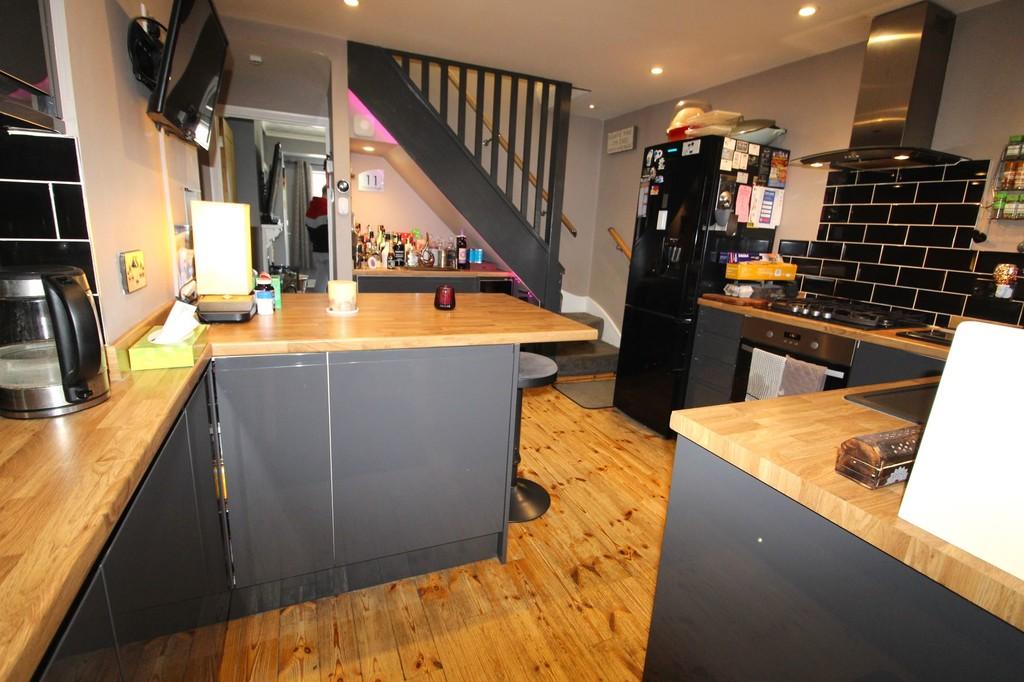 KITCHEN/BREAKFAST ROOM 12' x 11' 6" (3.66m x 3.51m) uPVC double glazed sash style window to rear elevation, feature strip panel radiator, re-fitted modern kitchen comprising one and a half bowl sink/drainer unit with flexible mixer tap over, wood effect work surfaces, range of fitted base units incorporating built in stainless steel oven with built in four burner gas hob over, space for fridge/freezer, built in dishwasher with matching door, built in wine cooler, tiled to all splash areas, further range of wall mounted units incorporating fitted stainless steel extractor hood, built in breakfast bar with matching work surface, wooden flooring, stairs rising to first floor, sunken spotlighting, oak veneered door to:
