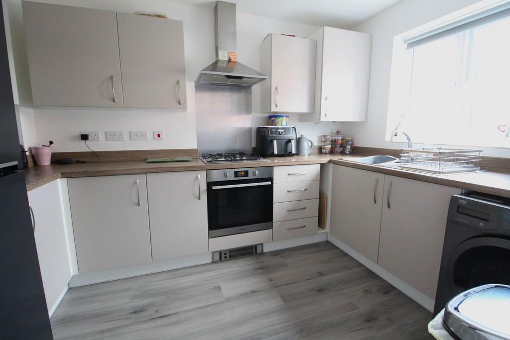 KITCHEN 11' 1" x 7' 8" (3.38m x 2.34m) uPVC double glazed window to front elevation, fitted modern kitchen comprising one and a half bowl stainless steel sink/drainer unit with mixer tap over, wood effect work surfaces, range of base units incorporating space and plumbing for washing machine, space for fridge/freezer, built in stainless steel oven with built in stainless steel four burner gas hob over, further range of wall mounted units incorporating fitted stainless steel extractor hood, hidden wall mounted gas combination boiler, laminated wood effect flooring.