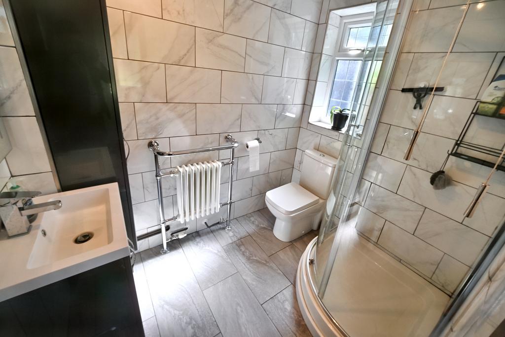 Recently refitted with a modern white suite comprising corner shower unit, vanity unit, low level WC, radiator and chrome heated towel rail, marble effect tiled walls & flooring, extractor fan and double glazed leaded window to side.