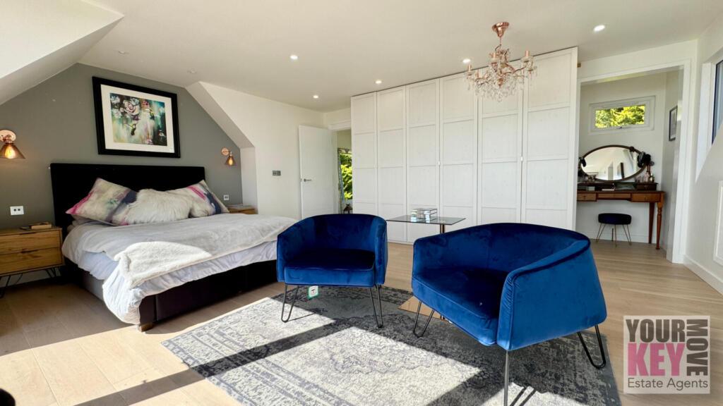 When I first walked up the stairs and into the fourth bedroom (the principle suite) on the top floor during our valuation, I was surprised to say "Oh wow" for a second time on my grand tour. For although I had already seen the view from the top of the garden, the views and impression you get from this gem of a room are impossible to beat. The most wonderful bespoke bi-folding glass doors look out over the second balcony to the most magical sea views (turquoise on the day we visited). I think that what made this even more impressive was the absolutely huge bedroom they look out of. With large fitted floor to ceiling wardrobes on one side and a seating area in front of the windows, this room is not just impressive but functional. There is a hidden dressing area neatly tucked away at the back and one of the nicest en-suit bathrooms we have seen beyond. The en-suite is a fully tiled wet room with a large shower and also has a magnificent skylight just over the modern free standing bath, perfect for lying in at both day and night time.