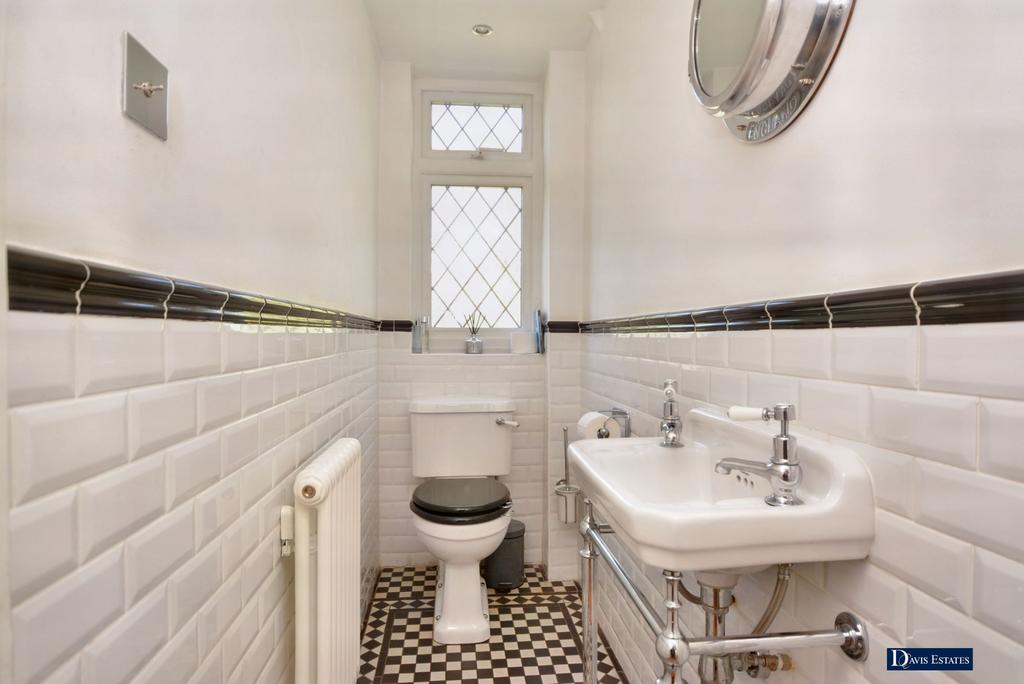 Obscure double glazed window to the rear. Suite comprising low flush WC and wash hand basin. Tiled walls and flooring. Radiator. Inset downlighters.