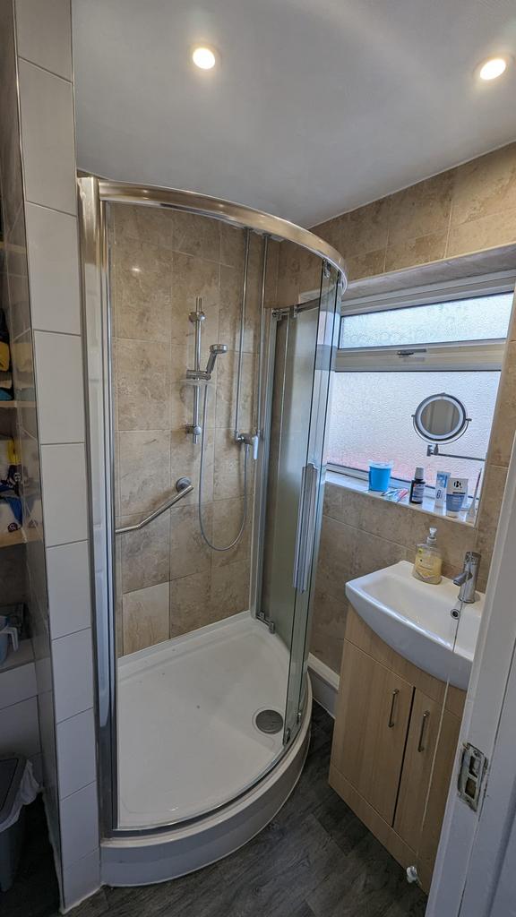 Double glazed window to front aspect, walk in shower cubicle, low level w.c. wash hand basin with vanity unit