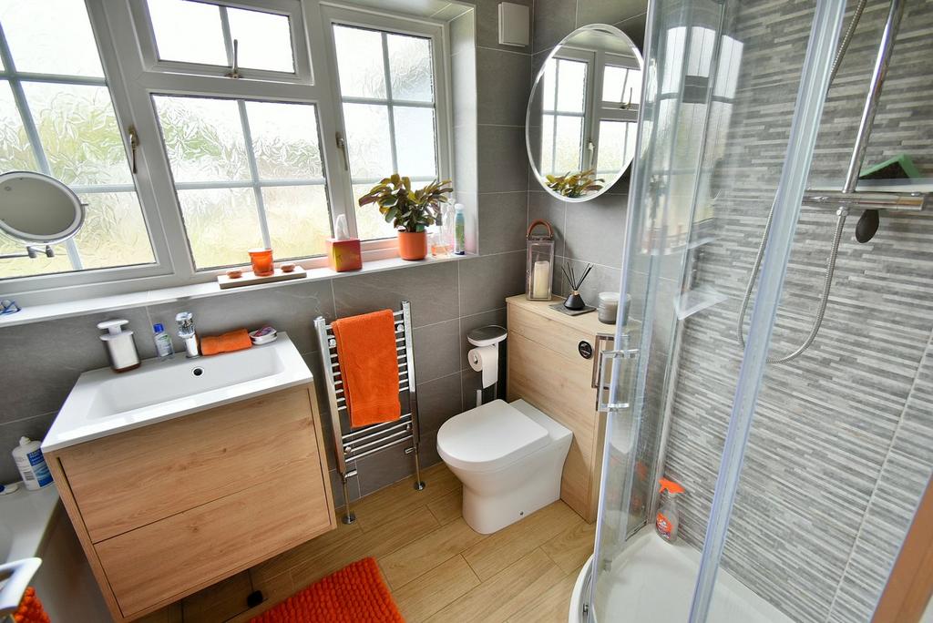 • Refitted and spacious family bathroom/shower room incorporating a corner shower cubicle with chrome raindrop shower head and separate shower attachment, WC with concealed cistern, wash hand basin with vanity storage beneath, fully tiled walls and flooring