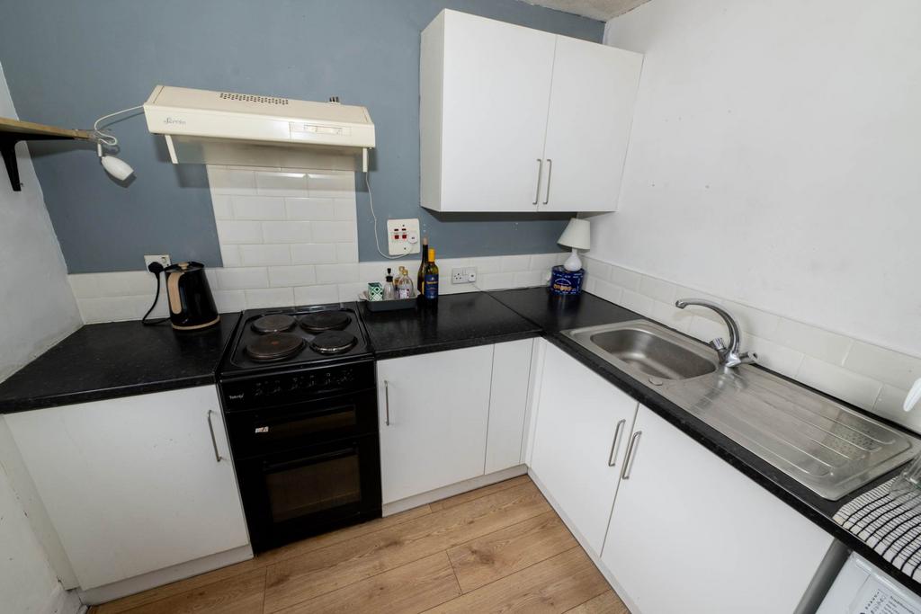 Fitted with a collection of wall and base units, inset sink unit and mixer tap. Freestanding oven and hob, space and plumbing for a washing machine along with space for a fridge/freezer. Tiled splashbacks.