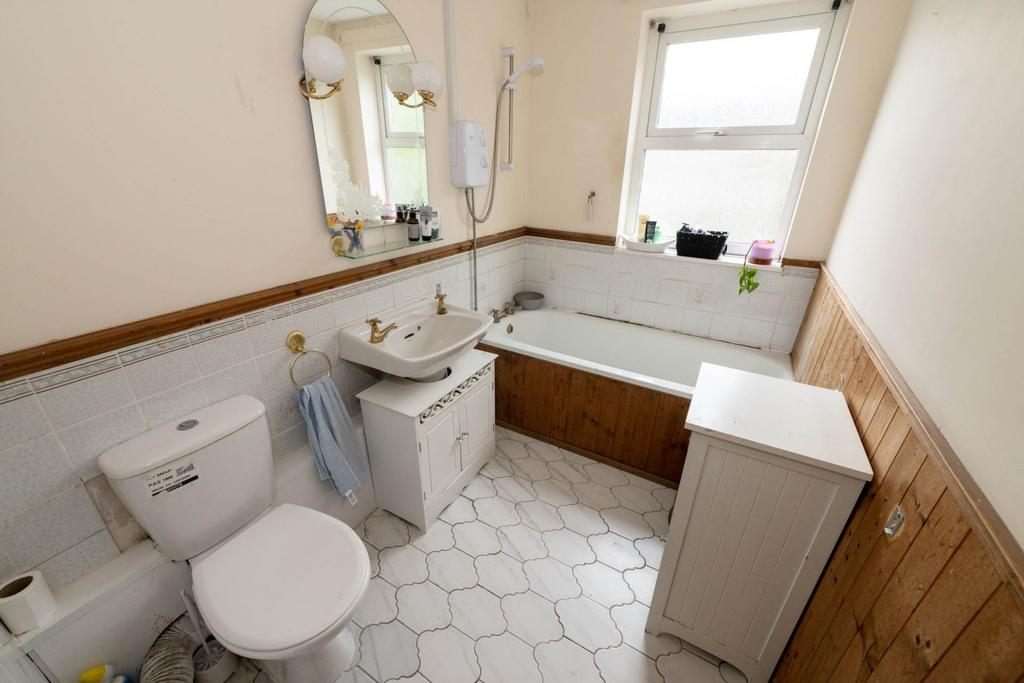 Consisting of a white suite of bath with overhead shower, matching washbasin and wc. Part tiled walls and frosted window.