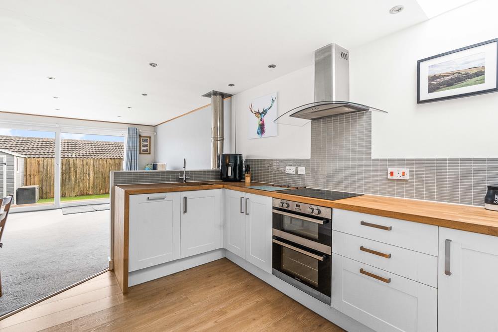The kitchen consists of plenty of white floor and wall units with wooden worktops. There is a built in electric oven and grill with ceramic hob and stainless steel extractor over. The kitchen also has an integrated fridge freezer and dishwasher along with a stainless steel sink.