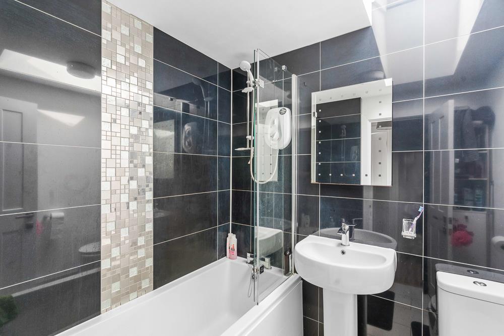Opposite bedroom 2 is the family bathroom which is a good-sized room with tiled walls and floor. The white bathroom suite consists of bath with a mixer tap shower above and glass shower screen, a WC and pedestal basin.