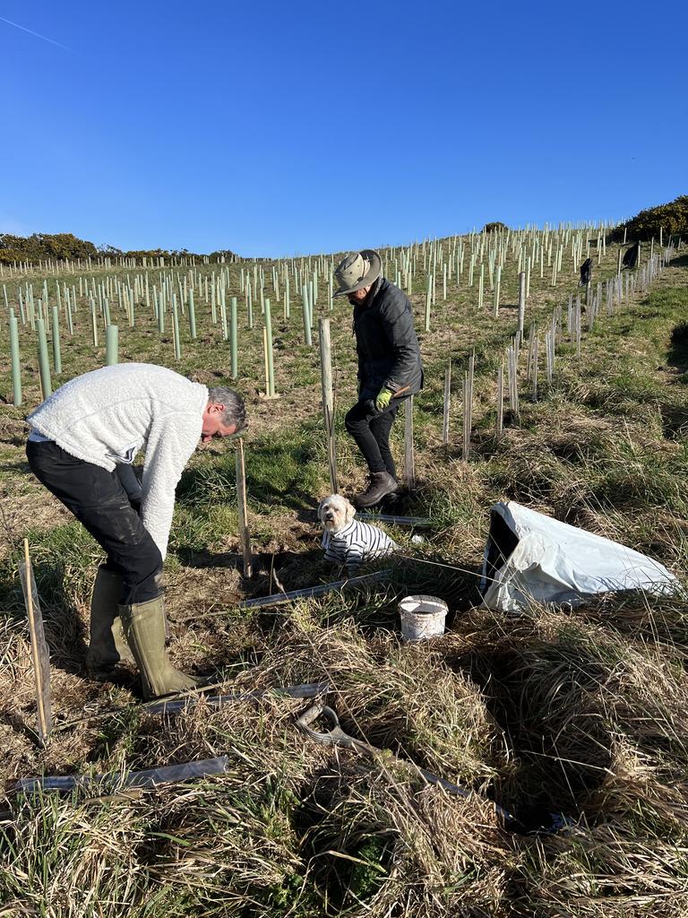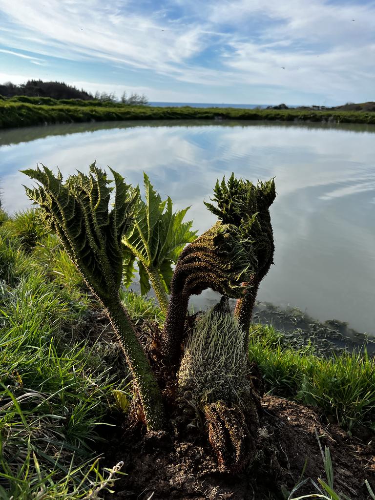 The pond is located just below, the azure water contrasting with the green grass which surrounds it. Lined with bentonite clay, the pond holds water the year round and has a developing bed of plants and reeds around its perimeter, including some fabulous Gunnera plants which explode into life come the summer. Rustic stones form steps down in the water. A number of willow trees have been planted on the bank surrounding the pond along with a plethora of wildflowers which bring the land to life in the summer. A copse of silver birch trees have been planted just below the bank.