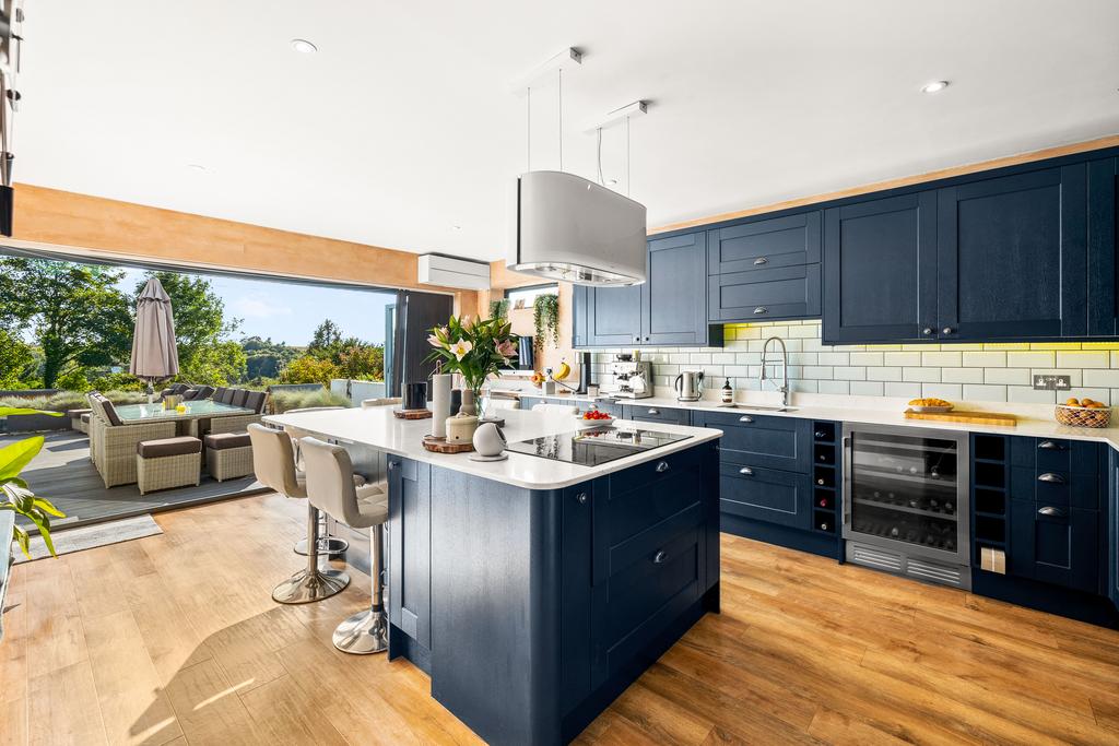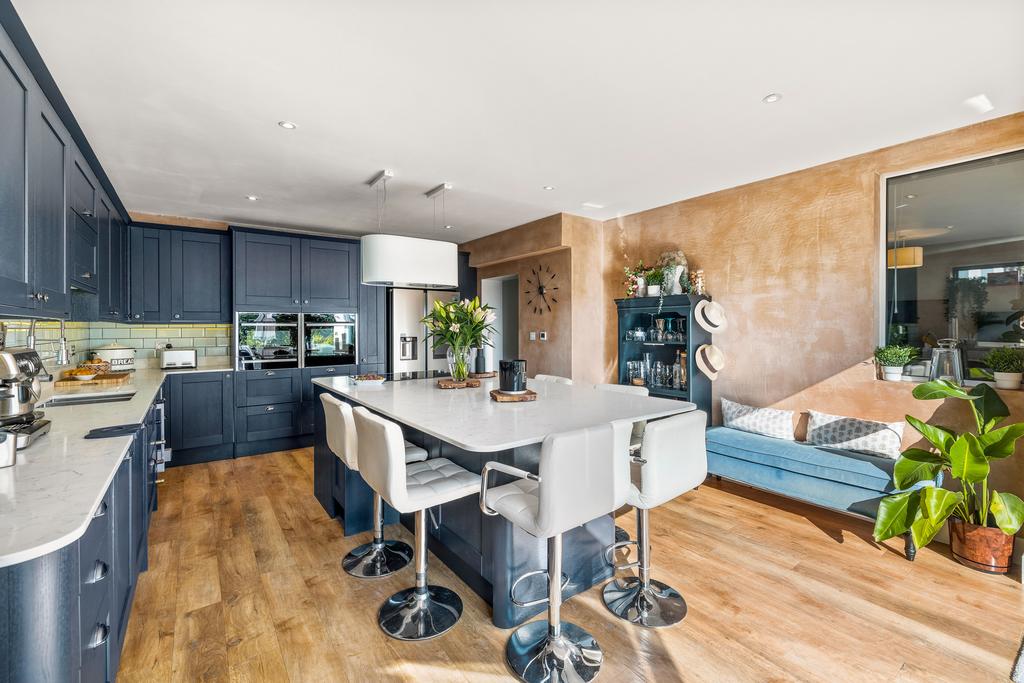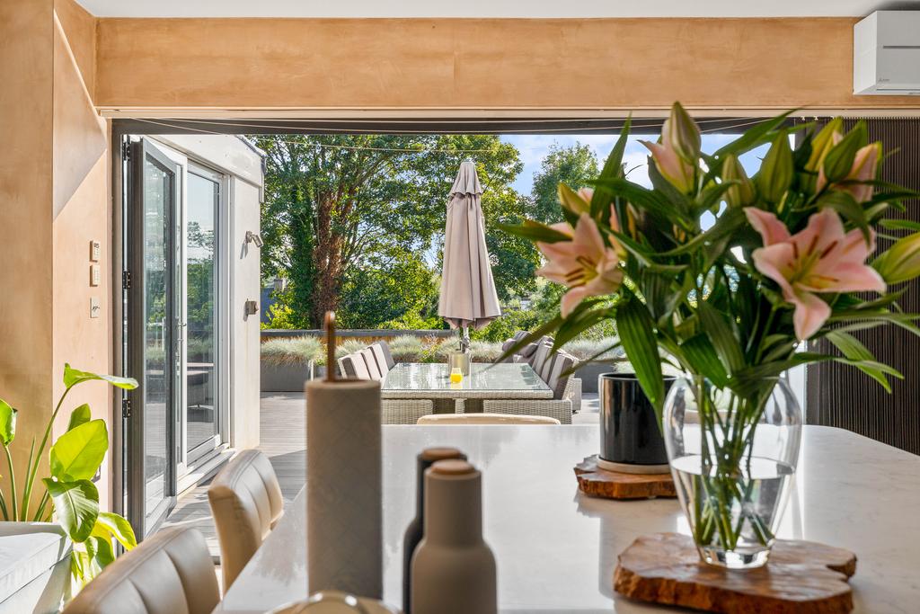 The heart of the home is undeniably the extended open-plan kitchen, which features contemporary fittings, a chic island, and state-of-the-art appliances. The floor-to-ceiling sliding doors frame the picturesque garden views and flood the space with natural light, creating an inviting atmosphere that extends to the al fresco dining area on the terrace.