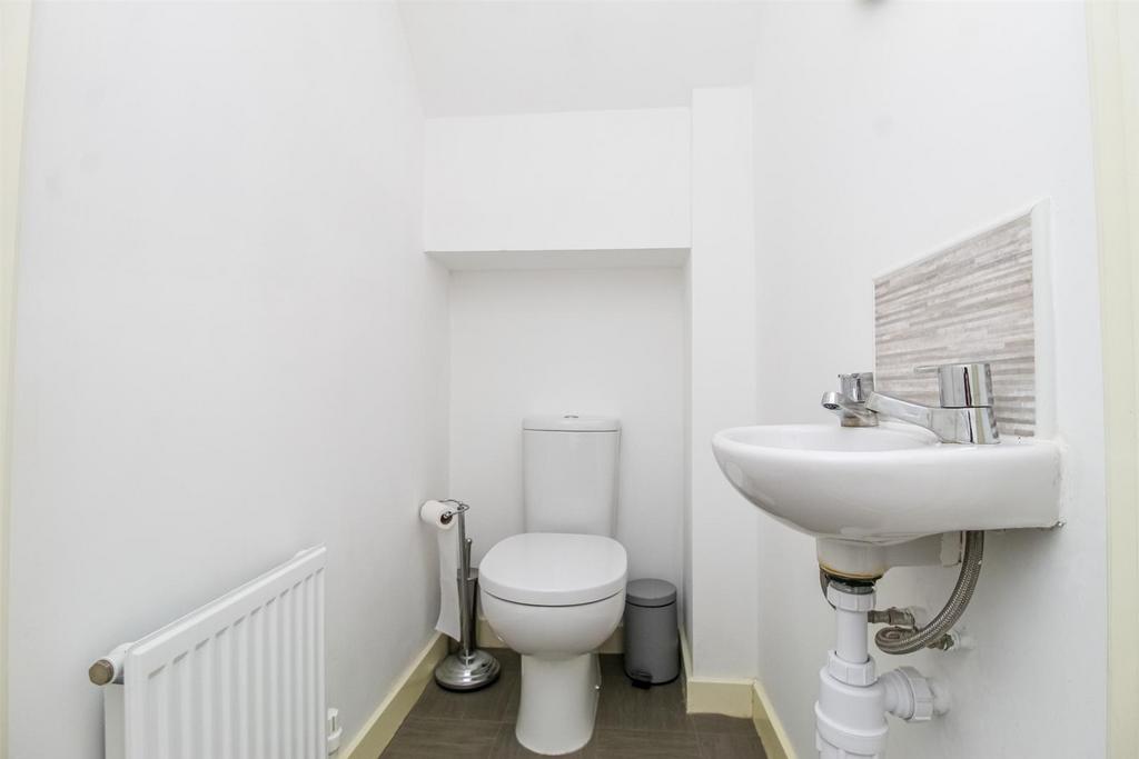 W.C. - 1.4m x 0.95m (4'7" x 3'1") - Central heating radiator, low flush w.c., extractor fan and wall mounted wash basin with tiled splash back.