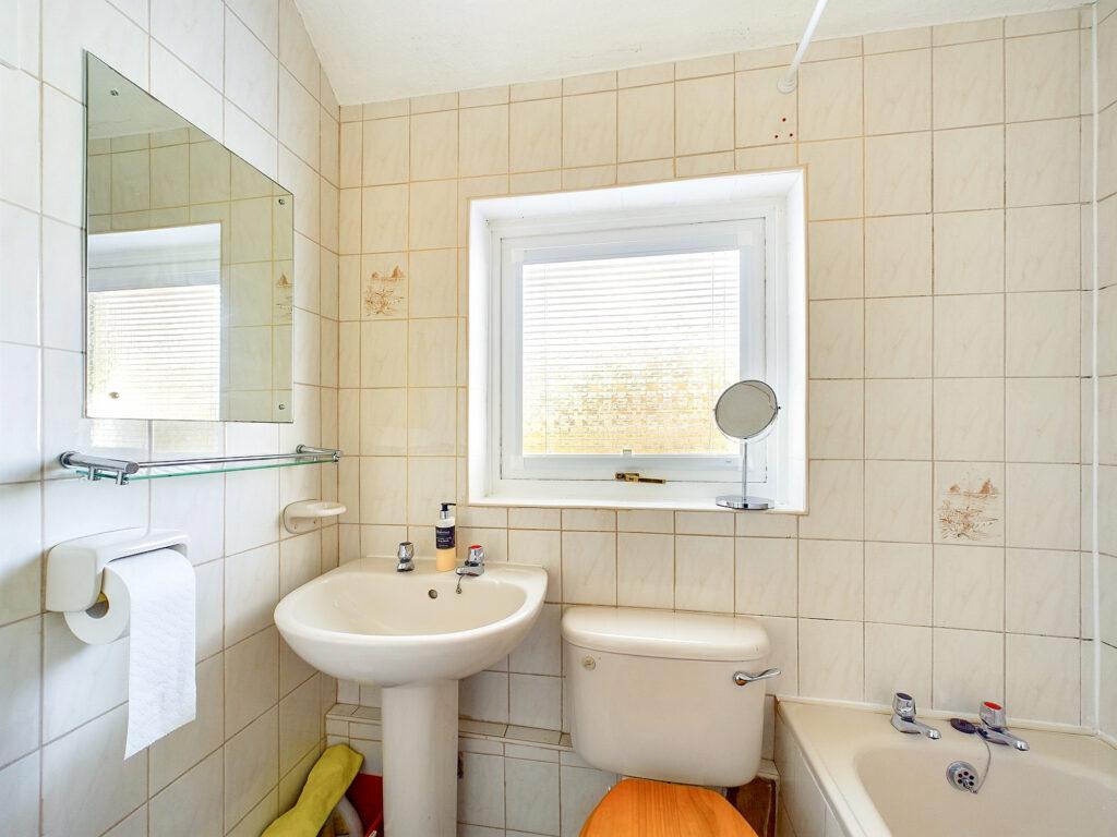 Cream three piece suite with electric shower over bath. WHB and WC. Opaque window views to rear with inbuilt blinds, tiled walls, pendant lighting, wall mounted soap dish, toilet roll holder and toothbrush holder with glass shelf above. Wall mounted Dimplex fan heater.