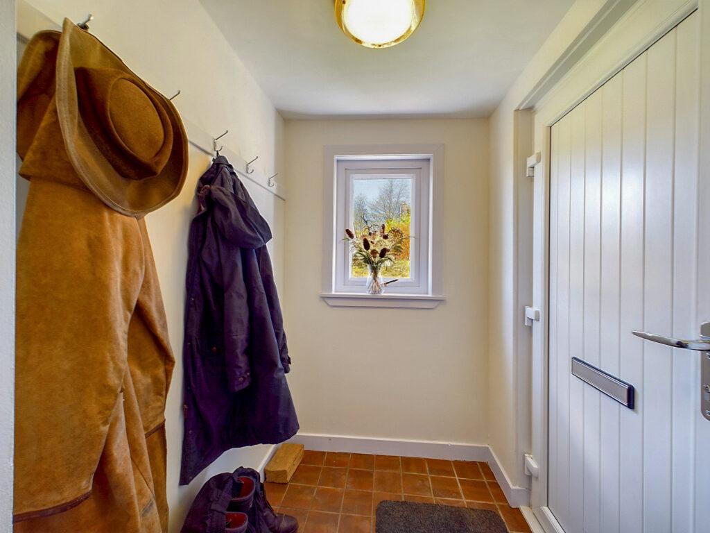 New UVPC door with letterbox into entrance porch with coat hanging and space for boot storage. Pendant lighting, tiled flooring, linked smoke detector, window view to rear gardens and countryside beyond.