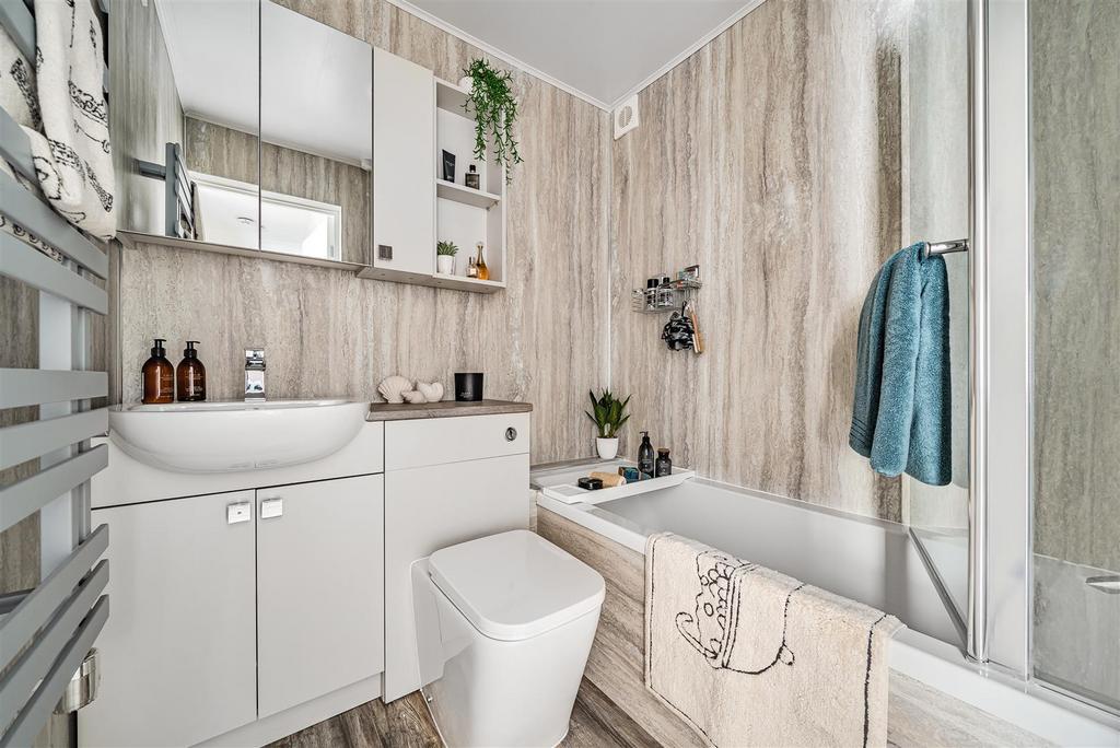 Bathroom - Three-piece suite comprising panelled bath with electric shower over, vanity unit housing tabletop sink, low level WC, heated towel rail, coved ceiling, respatex style covered walls, laminate flooring.