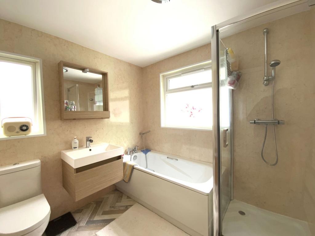 Bathroom A dual aspect bathroom with a double glazed frosted window to the rear and side aspects. Fitted with a four piece matching white suite comprising a floating style hand wash basin with waterfall style mixer tap, push button W/C, panel fronted bath and a shower unit with mains shower above. Fully decorated walls with marble effect PVC panels creating a modern and easy clean finish. Parquet effect vinyl hard flooring. White heated towel radiator.