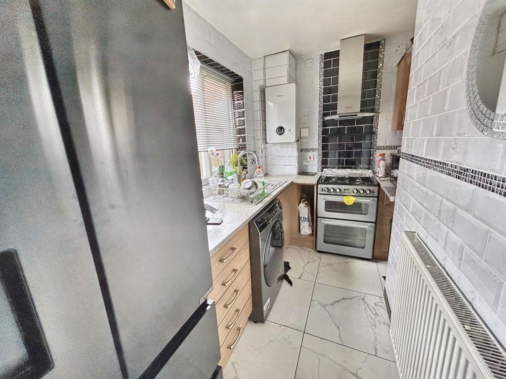 Double-glazed window, gas central heating radiator, sink unit with mixer tap, plumbed for washer, gas cooker point, extractor hood, fitted wall and base units with a roll top work surfaces and a door to the external.