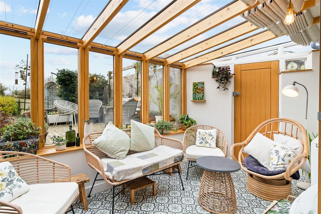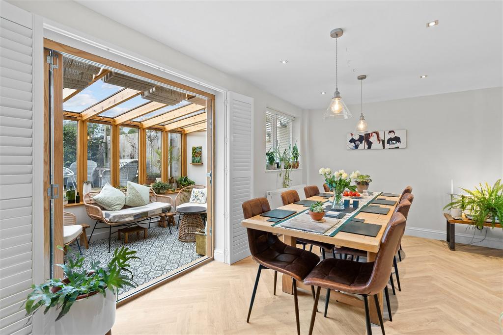 In detail, the accommodation comprises a reception hall with a door leading to the study, a large dual aspect sitting room with a log burner, in turn leading to an inner hallway. Stairs rise to the first floor with built in storage cupboards and a family bathroom comprising panelled bath, W.C, wash hand basin and heated towel rail. A quite stunning kitchen is the real hub of the home fitted with an extensive range of eye and base level units with work surface over incorporating a small breakfast bar and butler sink. There is a window to side aspect and personal door leading to the rear garden. The kitchen opens into a wonderful dining/living room with bi folding doors leading to the superb sun room.