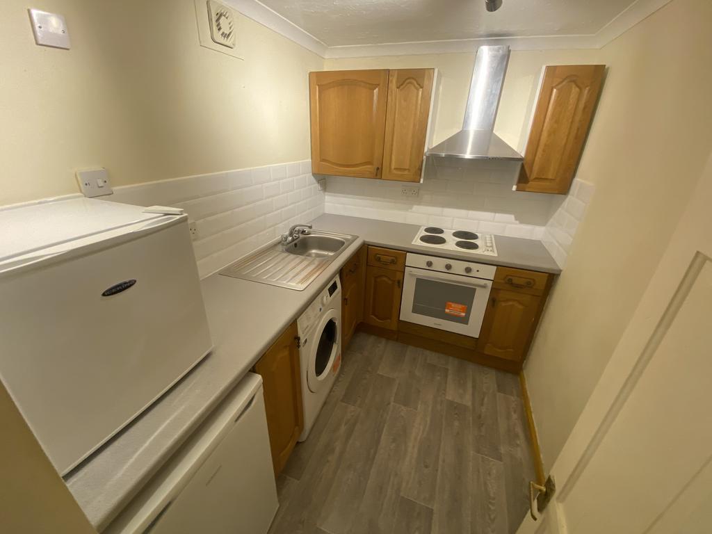 The accommodation on offer comprises a hallway with a spacious storage cupboard, sitting/dining room with a feature fireplace with a kitchen off fitted with a range of base and wall mounted units, fully tiled splashback and integrated oven, stove and extractor fan, a well-proportioned double bedroom and a bathroom with a three-piece white suite and mains shower over the bath.