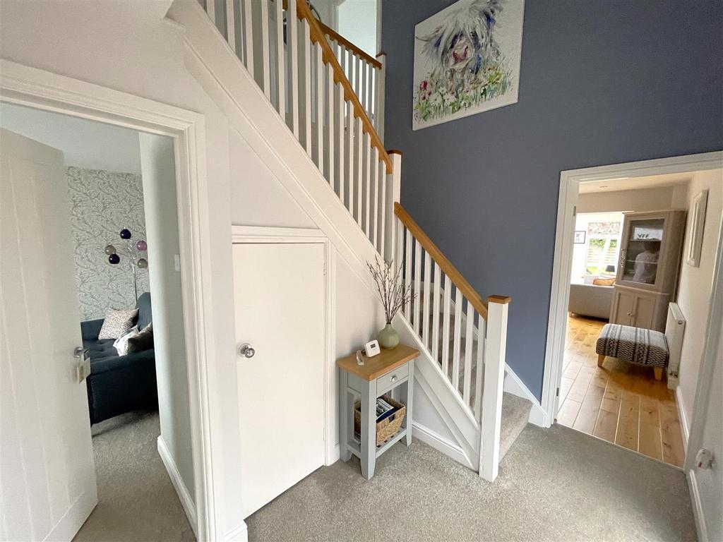 Initial Entrance Hall - 3.18m x 2.69m into stairwell (10'5" x 8'10" into s - An attractive initial entrance vestibule having high vaulted ceiling, exposed purlin, spindle balustrade turning staircase rising to first floor landing, useful under stairs storage cupboard beneath, contemporary column radiator and two double glazed windows to the front.