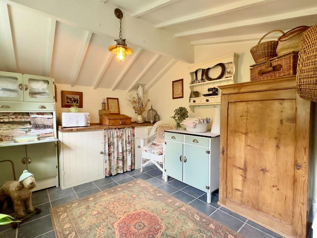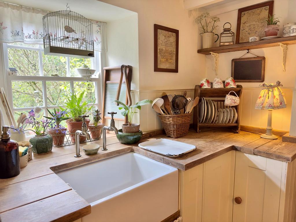 2 double glazed windows to front. Cupboard housing space and plumbing for automatic washing machine and tumble dryer to side. Further cupboard housing oil fired boiler supplying domestic hot water and central heating. Solid timber worktop over. Tiled floor. Door to rear and stable door to front.