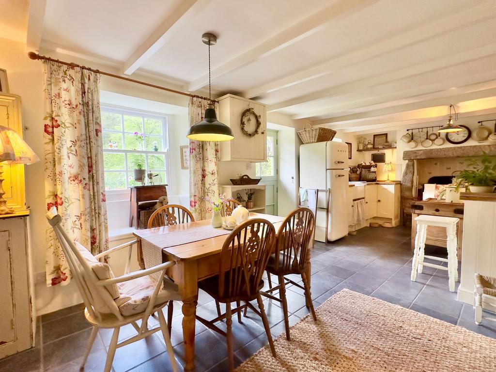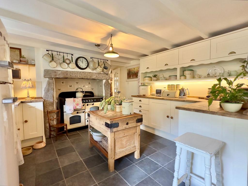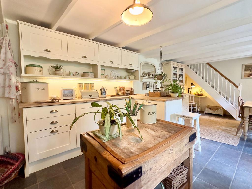 2 double glazed sash windows to the front. The kitchen is presented in farmhouse style with custom base cupboards with solid timber worktops over together with shelving and cupboards above. Butler style sink unit. Large former fireplace recess with granite reveals housing range cooker. Tiled floor. 2 radiators. Space and power for fridge. Stairs to first floor. Beamed ceiling. Half glazed door to